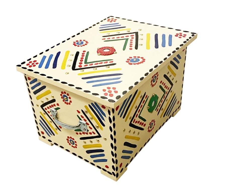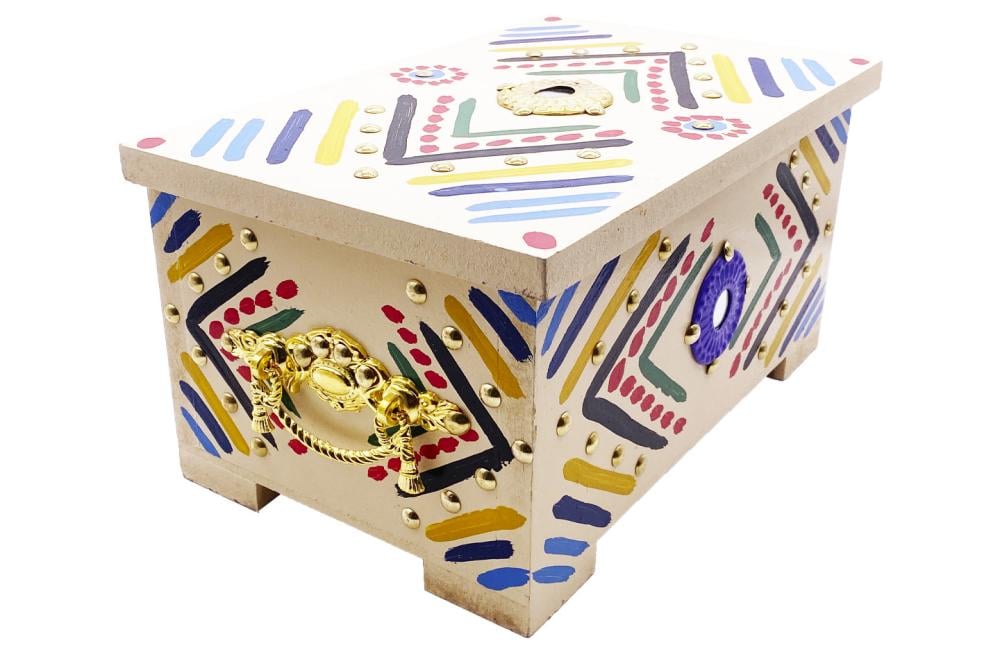 أضف لمسة أصالة ورقي لديكور منزلك مع صندوق خشبي تراثي بيج مزخرف يدويًا برسومات فنية دقيقة تعكس جمال الحرف اليدوية التقليدية.