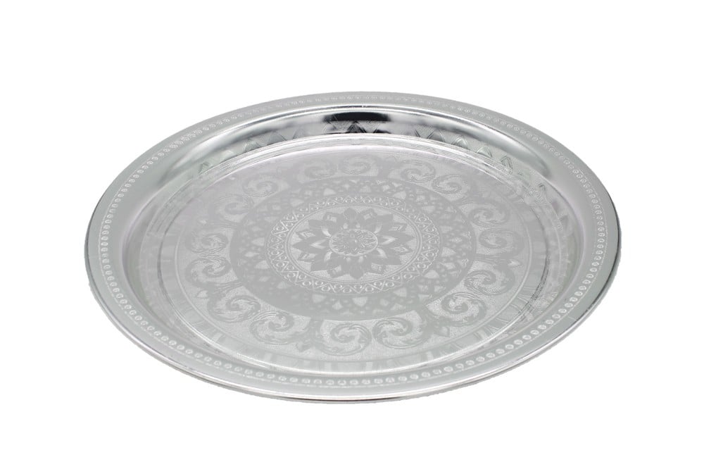 صينية ذو جمال واناقة فخمه للغايه مع الحفاظ على الرونق التراثي , الصينية مصنوعة من المعدن العالي الجودة والمصقول ومطعمة بالحفر المزخرف بزخارف شرقية مميزة. الصينينة محفورة ومزخرفة يدوياً من قبل الحرفيين المهرة في تايلند مما يجعلها قطعة فنية فريدة. المعدن صحي للأغذية وجذاب يدوم طويلاً عند الالتزام بالغسل اليدوي, متوفره بعدة مقاسات.